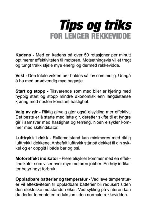 Denne brukermanualen for elsykkel tar kort for seg noen av de viktigste punktene ved bruk og vedlikehold av en elsykkel. Her finner du informasjon om vedlikehold, vask, transport av elsykkel, behandling av batteri, tips og triks, rekkevidde osv.